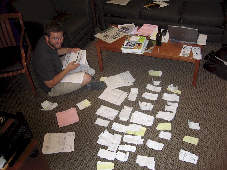 My friend Kevin, seen here sorting receipts for stuff purchased towards our build out, had boldly prevailed in the 2003 auction picking up three allocations that would serve Missoula. Never mind that Missoula was approaching radio saturation. We had the (over)confidence of a small python swallowing a large pig.